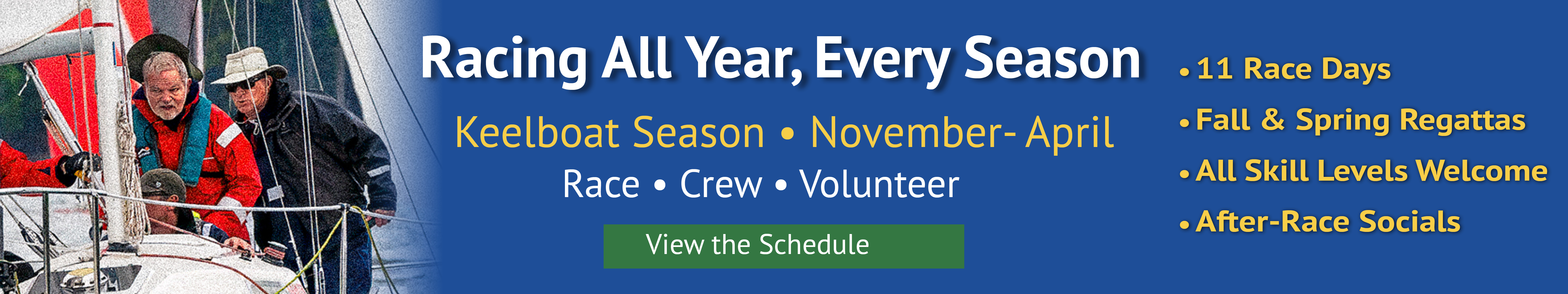 Our racing program consists of a series of races from May through October for centerboard boats, and from November through April for keelboats. In addition to biweekly races and regattas, numerous social events are sponsored by the club, including the annual Spring Fling and Fall Ball, moonlight sails, regattas and parties.